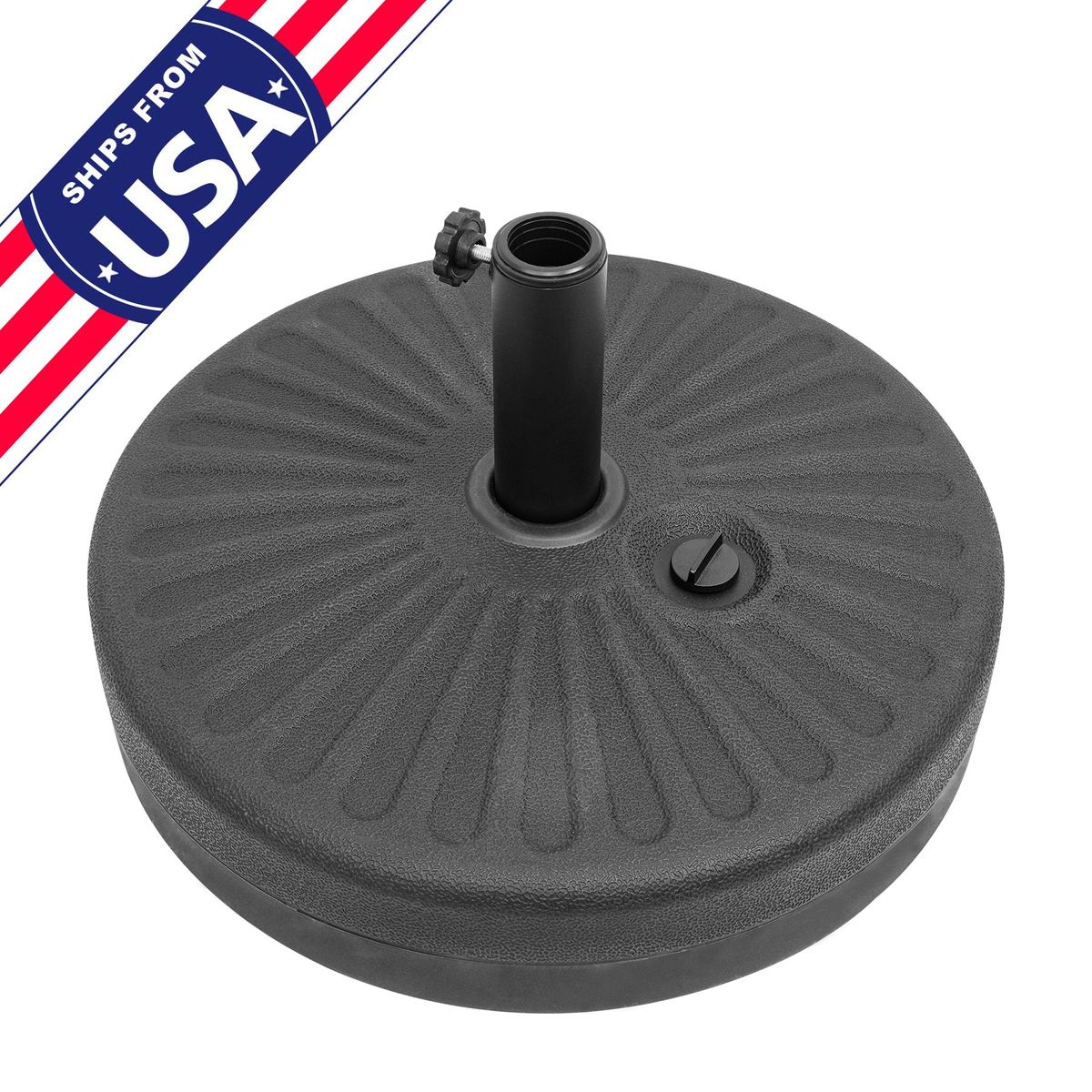 Secure your patio umbrella with confidence using our durable, water-filled umbrella base. Made from tough, weather-resistant plastic and reinforced with a galvanized, rustproof steel pipe, this base is built to withstand the elements without tipping or corroding. An adjustable knob keeps umbrella poles firmly in place, even in windy conditions. It includes two steel tubes to fit most standard market umbrellas with pole diameters from 1.5" (38mm) to 1.9" (48mm), offering maximum versatility. When not in use, the steel tube can be removed for easy, space-saving storage. Simple to fill and drain, this base delivers reliable, non-permanent support—perfect for outdoor promotions, cafés, trade shows, resorts, and more.
